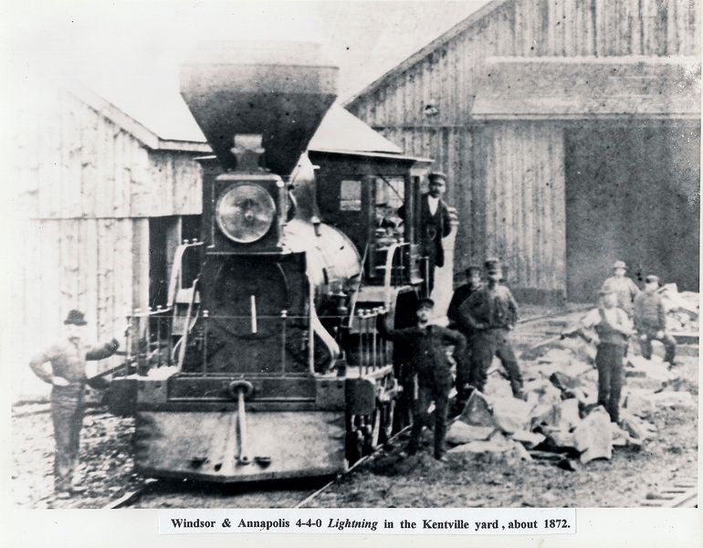 Windsor & Annapolis 4-4-0 Lightning in front of the the Kentville Engine House and Machine Shop, about 1872. This photo is a crop of this photo that show the entire engine house: File:Kentville Engine House and Lightning 1872.jpg.