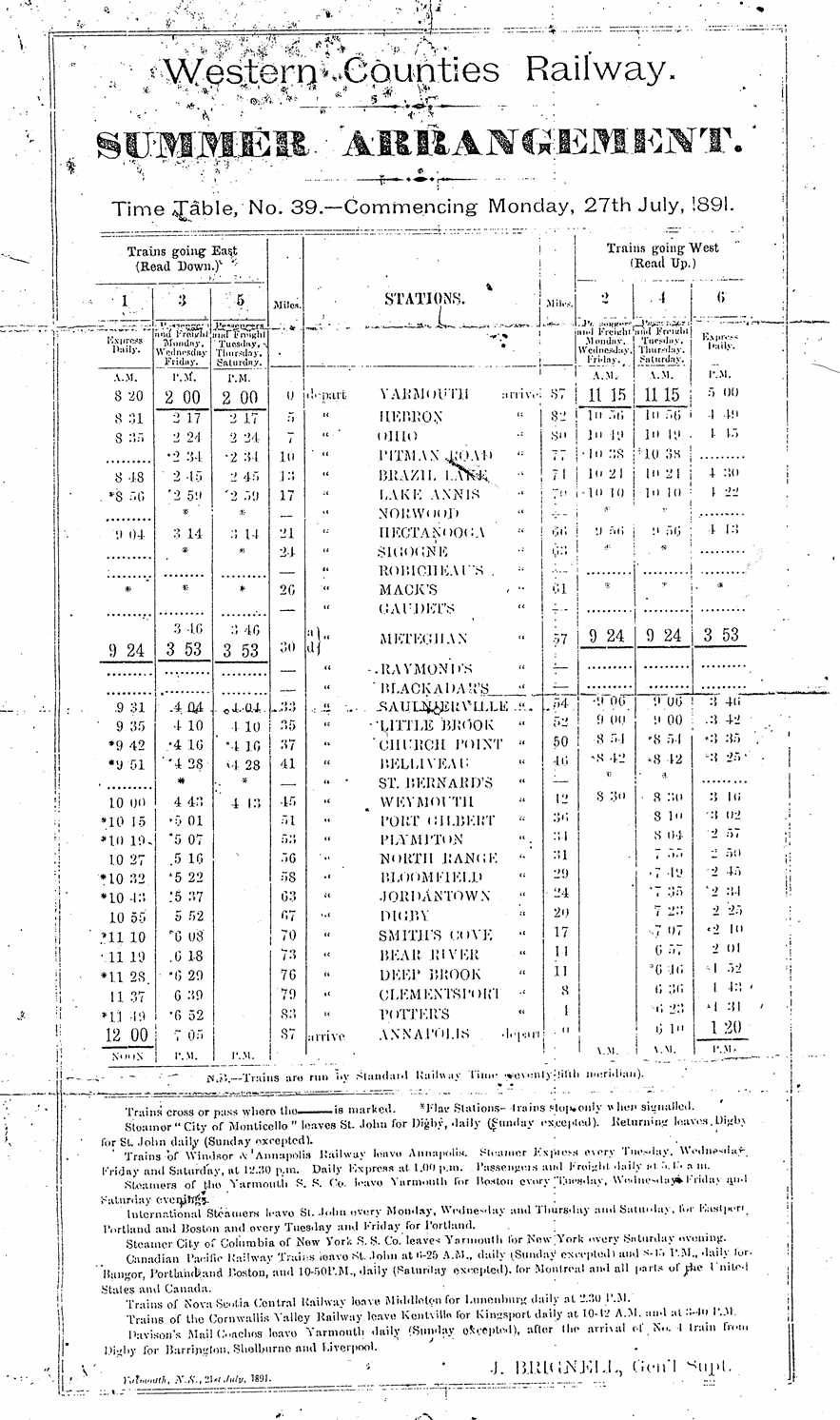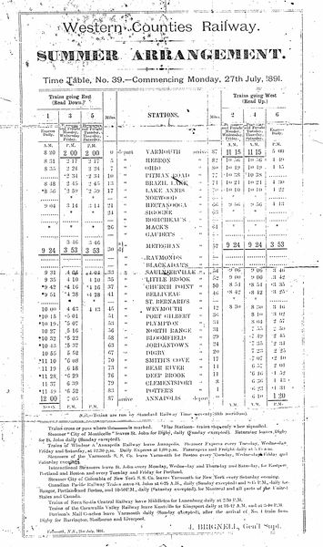 Western Counties Railway Employee Timetable, July 27, 1891.