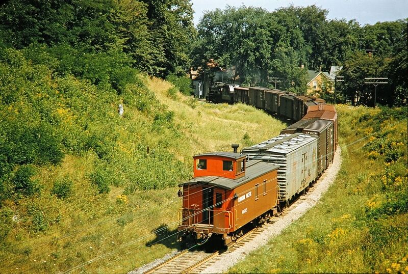DAR locomotive No. 1038 and caboose No. 435073 negotiating the sharp curve from the Avon River Bridge with the Kentville to Windsor freight train No. 94 to arrive at Windsor, July 1956.