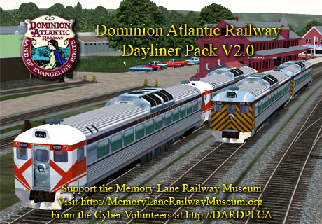 These are repaints of the Gaeton Belanger RDC1 model for the units that were used on the Dominion Atlantic Railway. These are Warpaint units 9058 & 9059 as delivered from the factory and Hockey Mask / Tuscan sideboard units 9058 & 9059. Hockey Mask 9058 is actually not historically accurate. 9058 was involved in an accident in 1966 while still dressed in it's Warpaint scheme and 9057 was sent in to replace it. 9058 never returned to the DAR although it was seen in service for years in Quebec dressed in the Hockey Mask / Tuscan sideboard scheme and relettered Canadian Pacific. So the model existed, just not lettered for or running on the the D.A.R. For those of us running the D.A.R. line on MSTS, it's just too nice to have them both still on the line, so here they both are anyway for your enjoyment.