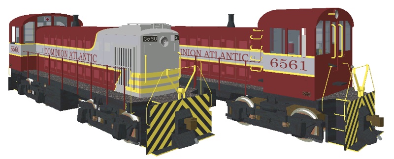 Dominion Atlantic 6560 and 6561 are MLW S3s created from my earlier FJ&G S2s that started from Allen Norton's TSM file "alcos1s3". The ENG file is Dick Cowen's from his S-1 kit. Model uses Dwight Mitchell's cab interior, Mark Toland's S-4 sound files, and Canadian Horn Pack by Devin LeGresley.