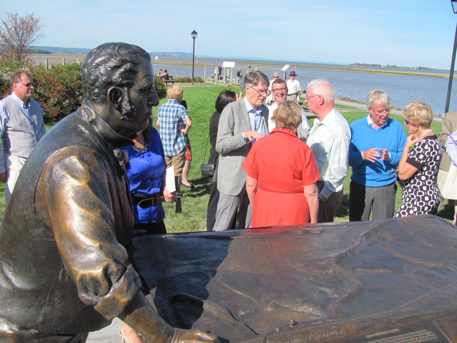 I went to the statue unveiling on Saturday Sept 21 and to the DAR concert that night. Great stuff. The sculpture, entitled "Work at the Trestle" (a nice railway pun), is a very realistic looking figure Vernon Smith, the construction engineer and first general manager of the W&A with his sleeves rolled up working on a figureative map of the W&A which shows the track section through Wolfville. Created by sculptor Ruth Abernethy, it has a wonderful relationship to landscape and the statue looks up from the map eastward along the DAR tracks depicted in the bronze map rolled out on the trestle table. The map even has 3-D tracks in close to Z scale. It is a nice piece of public history, paid for by a donation from the great grandson of Vernon Smith, Dr. Allen Eaves, and backed by a pledge to maintain it by the town of Wolfville. There was a great turnout for the unveiling. That evening Gary Ness gave a great talk on this history of the DAR with digital projections of DAR rolling stock phots nearly life-size on a movie screen backed by classic railway songs like the Wreck of the Old 97" by a group of musicians, The Mud Creek Boys.