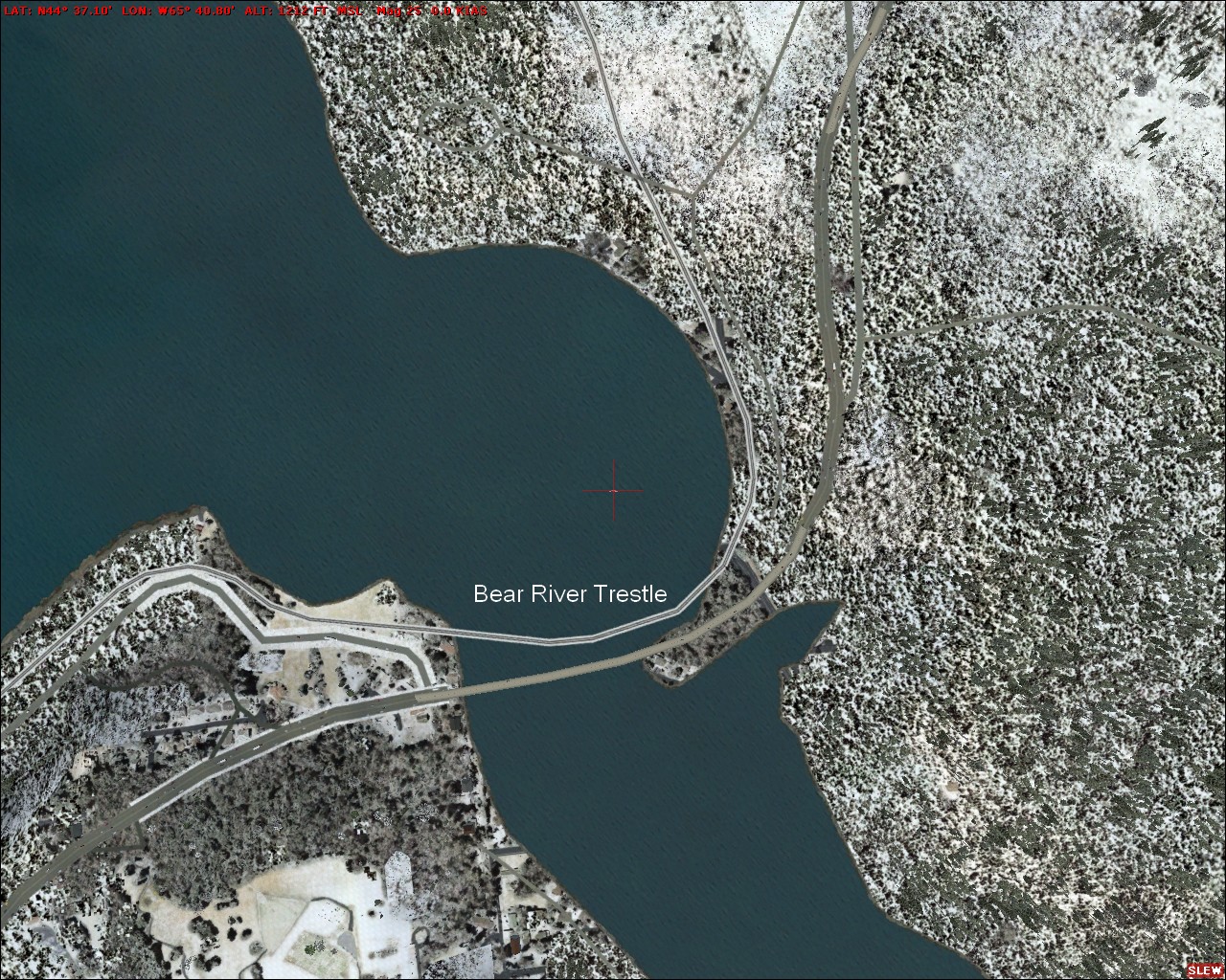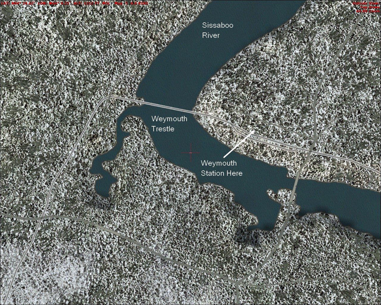 For years now, I have been quite heavily involved with Microsoft Flight Simulator. I recently installed the latest version FSX (Flight SImulator 10) and then installed an add-on software known as Ultimate Terrain Canada FSX. The first flight I took was out of the yarmouth NS airport (my home town) for no other reason than to check out the coastline (Ultimate Terrain has very detailed coastlines). Taking off from Runway 24 and climbing 1000ft, made a right hand turn and bagan a run straight up the harbour. AT the end of the harbour, something caught my eye. Dropping to 500 ft I saw that it was unmistakably the DAR rail line leading out of the town. Following it, I came across the turning wye situated exactly where it should have been. Continuing on, I followed the line to Hebron then on to South Ohio, Brazil Lake and Lake Anis and on to Hectanooga. Enthralled by what I was seeing, I continued up to the French Shore to Methegan, Church Point and right into Weymouth. Yes the trestle across the Sissaboo River is even there as well as the dual track in front of where the Weymouth Station used to be. I followed the old DAR line on into DIgby and back out pretty much exactly as it is marked on a map that I have. I could clearly see Joggins Bridge, Cornwallis and finally the Bear River trestle. I had to end my flight at that time but I assume (and will confirm) that the route continued to its end at Halifax.