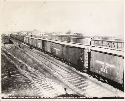 From September to April during the peak decades of the apple industry, apples were loaded at 150 apple warehouses along the DAR. Local trains brought them to Kentville to be marshalled into freights bound for steamships in Halifax. In peak seasons, this produced massive double-header 50 boxcar freight specials, as many as six special trains per weekend, requiring an extra switcher locomotive in Kentville and extra CPR vans from Montreal.(1) Apple trains also served the vinegar plants and apple evaporators such the Berwick Evaporator which ran all through the winter. This heavy traffic had to be maintained right through heavy winter snow conditions. In the early years of the W&A, and the DAR, many steamers met trains at Annapolis Royal for apples. The Kingsport Wharf and the Port Williams wharf also served as smaller shipping points for apples. However Halifax grew to be the largest destination for apple trains as it could better serve larger steamers.