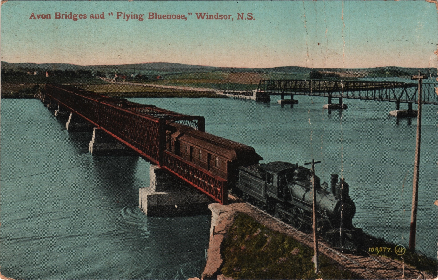 A postcard of the the DAR's first Avon River Bridge (The Basket Bridge) and the Flying Bluenose, Train No. 124 near Windsor, N.S. The postcard was mailed in 1914. Owner: Wolfville Historical Society