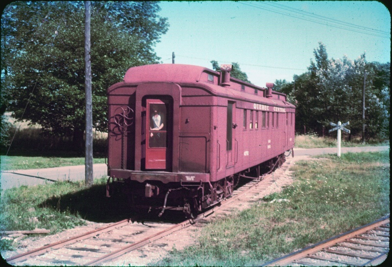Jim O'Donnell in an email to Steve Meredith on December 13, 2008 reports this about Quebec Central 40742: "I had never seen a photo of it in QC lettering. I took a photo of it at Truro when the new station was being built in 1959. At that time it was lettered Canadian Pacific 405801, in B&B ("Bridges & Buildings") Service. You can see in the photo all they did was repaint a portion of the letterboard and the area where the numbers were, then relettered it. That car was always one of my favourites, probably because it was so unique. I later measured it and drew a diagram of it, and finally a model in O scale. It was scrapped at Kentville in 1977. Harold Jenkins sent me a photo of the trucks from it when it was scrapped. He said that was all that was left of it. It had the initials QC cast into the truck sideframes."