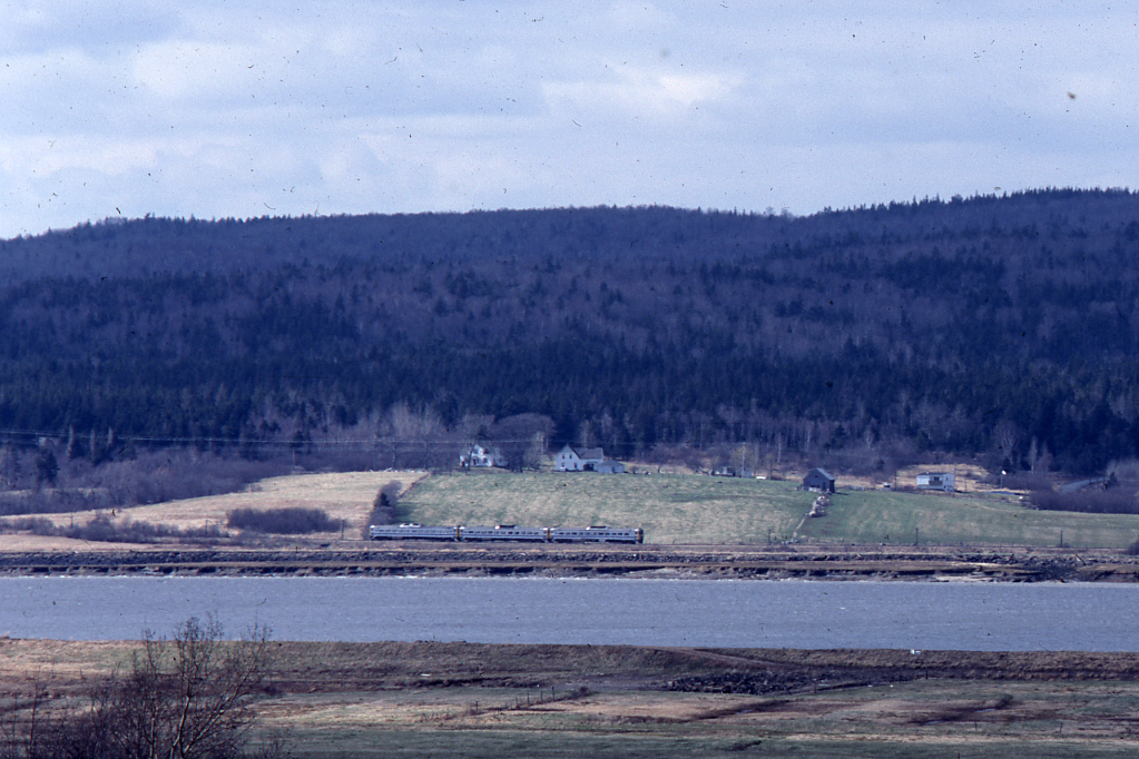 Train no. 154, VIA's eastbound Evangeline is seen along the south side of the Annapolis River at an unknown location on Sunday, April 19, 1981.