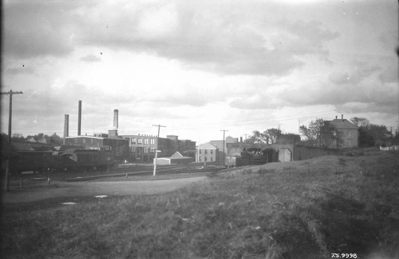 Yarmouth Railyard, 1925. Unknown photographer. The roundhouse is on the right and the cotton mill is in the background.