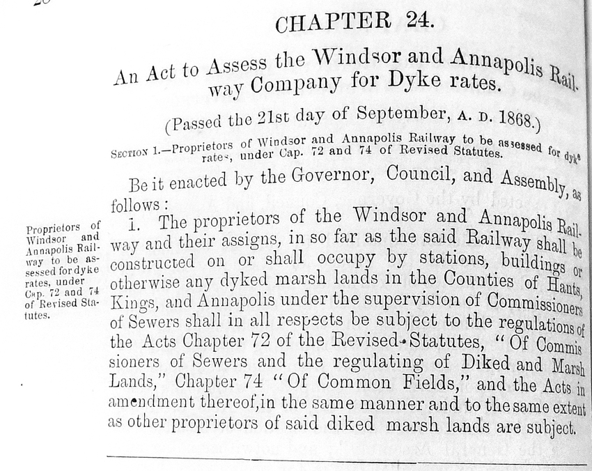 | current | 16:31, 25 June 2023 | 850 × 676 (407 KB) | Sarah Taylor (talk | contribs) | Source Nova Scotia Archives<br> Photograph of a page from a book of acts of the Nova Scotia Legislature passed in 1868.<br> Chapter 24 of the Acts of 1868<br> Page 1<br> Category: Nova Scotia Archives |