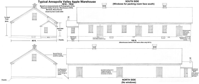 Plans of a typical 40' x 100' Annapolis Valley Apple Warehouse, circa 1910-1930, drawn by Dan Conlin in 2004 based on photographs of the Pleasant Valley Fruit Company warehouse in Berwick and measurements taken by Ric Hamilton.