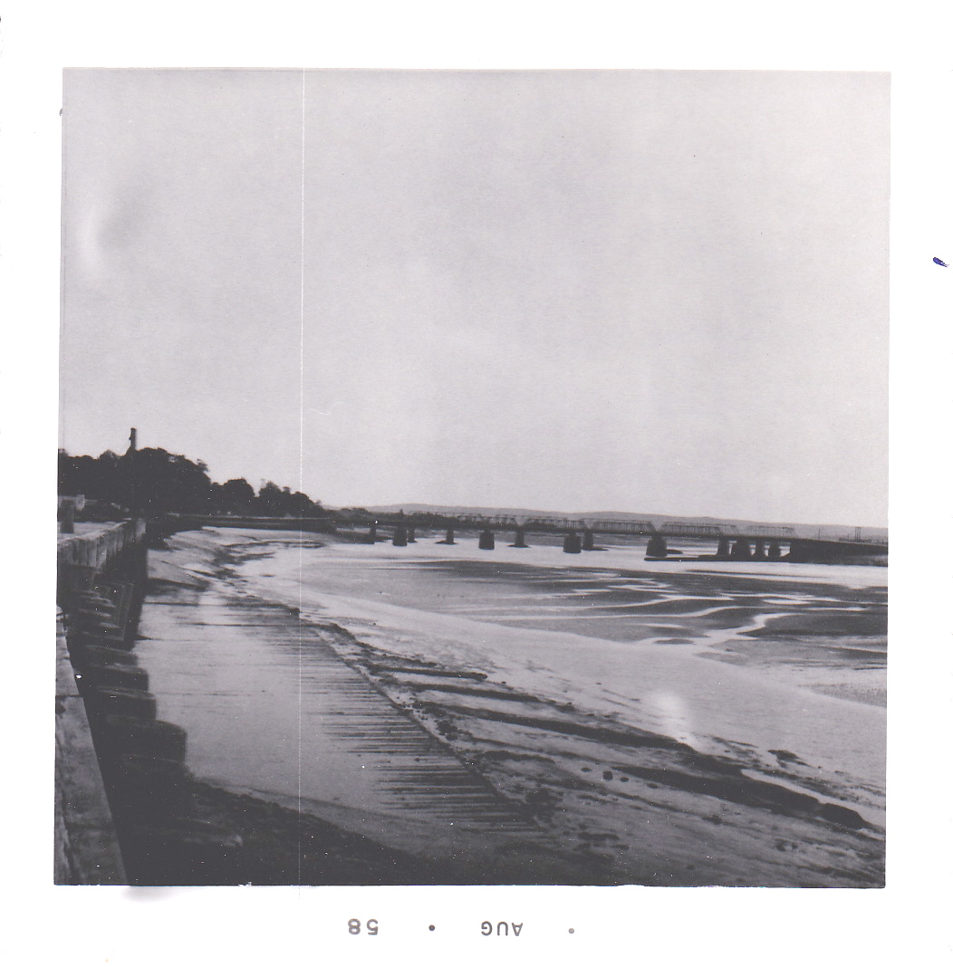 Avon River Bridges and Wharves, July 30, 1958 Comment on back: Avon River at Windsor N.S. Shows timbers on mud at wharf. In distance - highway and rail bridges. Left-rear - town of Windsor 7-30-58