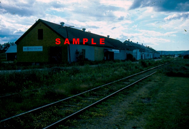 Original Kodachrome Slide, July 14, 1986. Dominion Atlantic tracks, with apple warehouses, Bridgetown, NS.