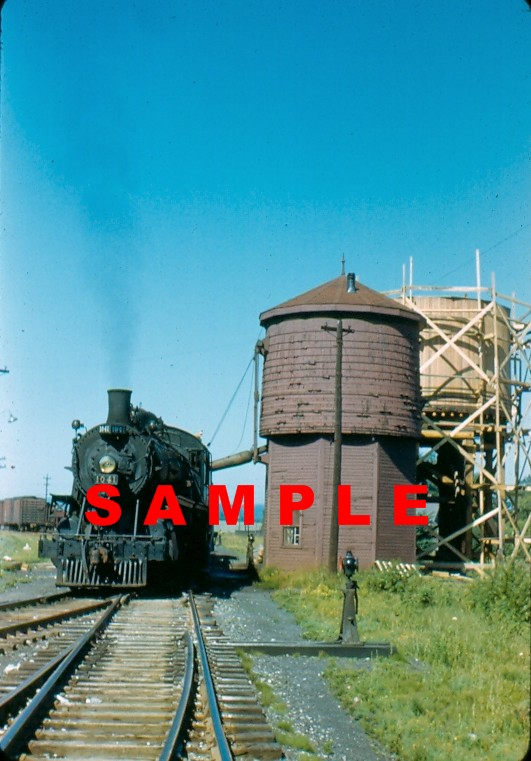 Original Kodachrome Slide, August 1949, Old and new water tanks at Windsor, NS with Locomotive No. 1041 leading Train No. 96 to Halifax on mainline.