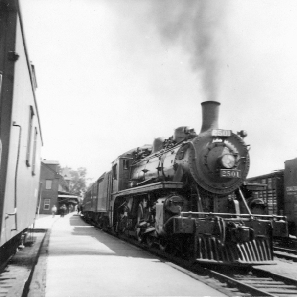 No. 2501 4-6-2 with combine and steel coach coupling on to Dayliner at Kentville preparing to leave for Yarmouth on July 31, 1958. THis is a B&W sister photo to Image:Dar2501 Kentville 8-1-58.jpg.