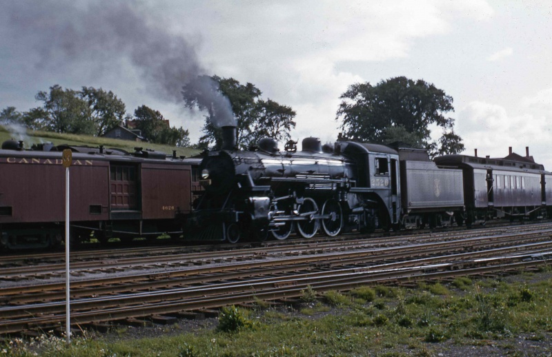 Original Kodachrome Slide, July 3, 1954, Dominion Atlantic Railway No. 2526, shunting in reverse Train No. 98 past Fruit Express car No. 4626 preparing to leave Windsor for Halifax in late afternoon.