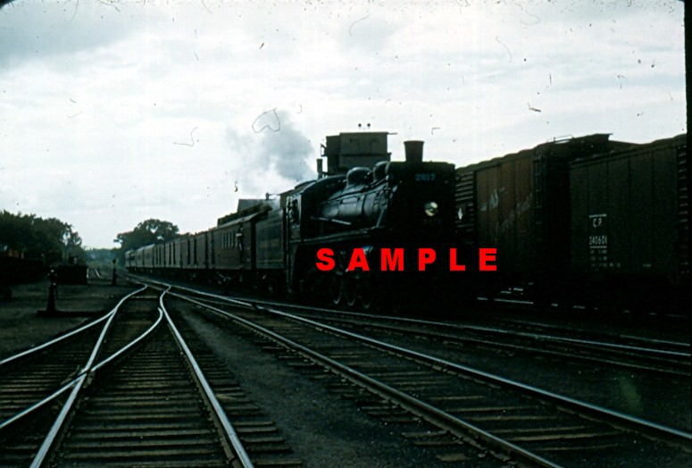 Original Kodachrome Slide, July 3, 1954, Dominion Atlantic Train No. 98 behind No. 2617, 4-6-2, in the Kentville Railyard just prior to arriving at the Kentville Station in Kentville, NS. This loco will be replaced with No. 2526 for the rest of the trip to Halifax. Note the coaling tower behind the locomotive.