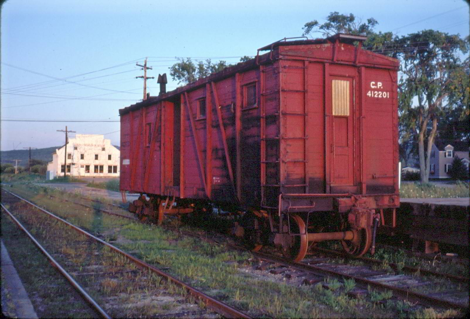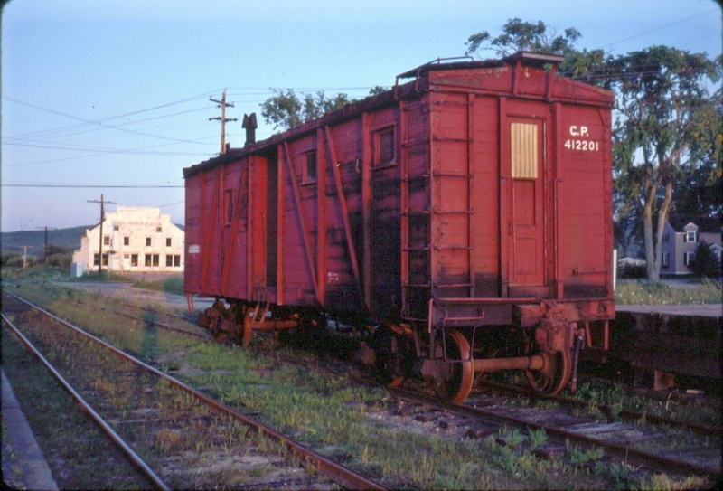 Crew car No. 412201 on the siding at Bridgetown across from the the station. When ballasting was required across the line, a front end loader and a loader operator were kept at the Round Hill Ballast Pit to load the ballast cars. This was the assigned crew car for the operator to stay in while he worked filling ballast cars in August of 1982. Looks like an old Fowler boxcar.
