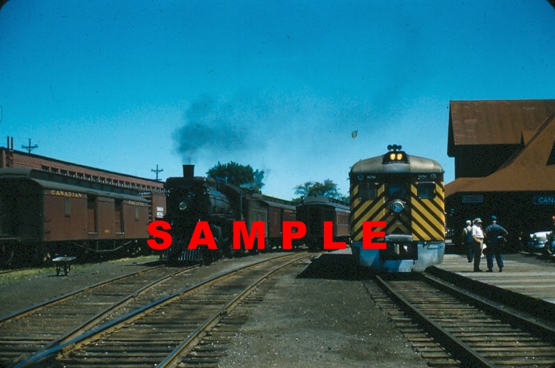 Original Kodachrome Slide, August 1, 1958, Dominion Atlantic Dayliner No. 9058 (Train No. 11), meets mixed Train No. 22, locomotive No. 2627 leading, from Truro and Kentville to Truro Wayfreight at Windsor Station in Windsor, NS. The photo also shows baggage car No. 4092 on the left.