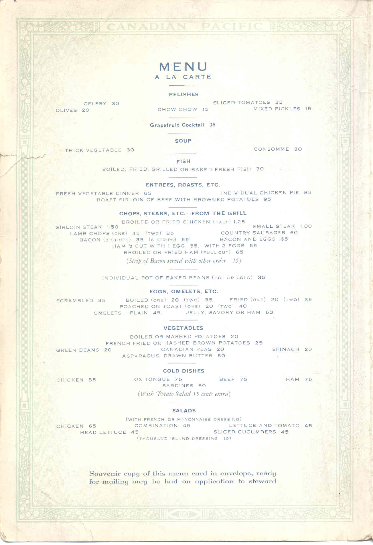 A Dining Car menu assumed to be from July 1930.