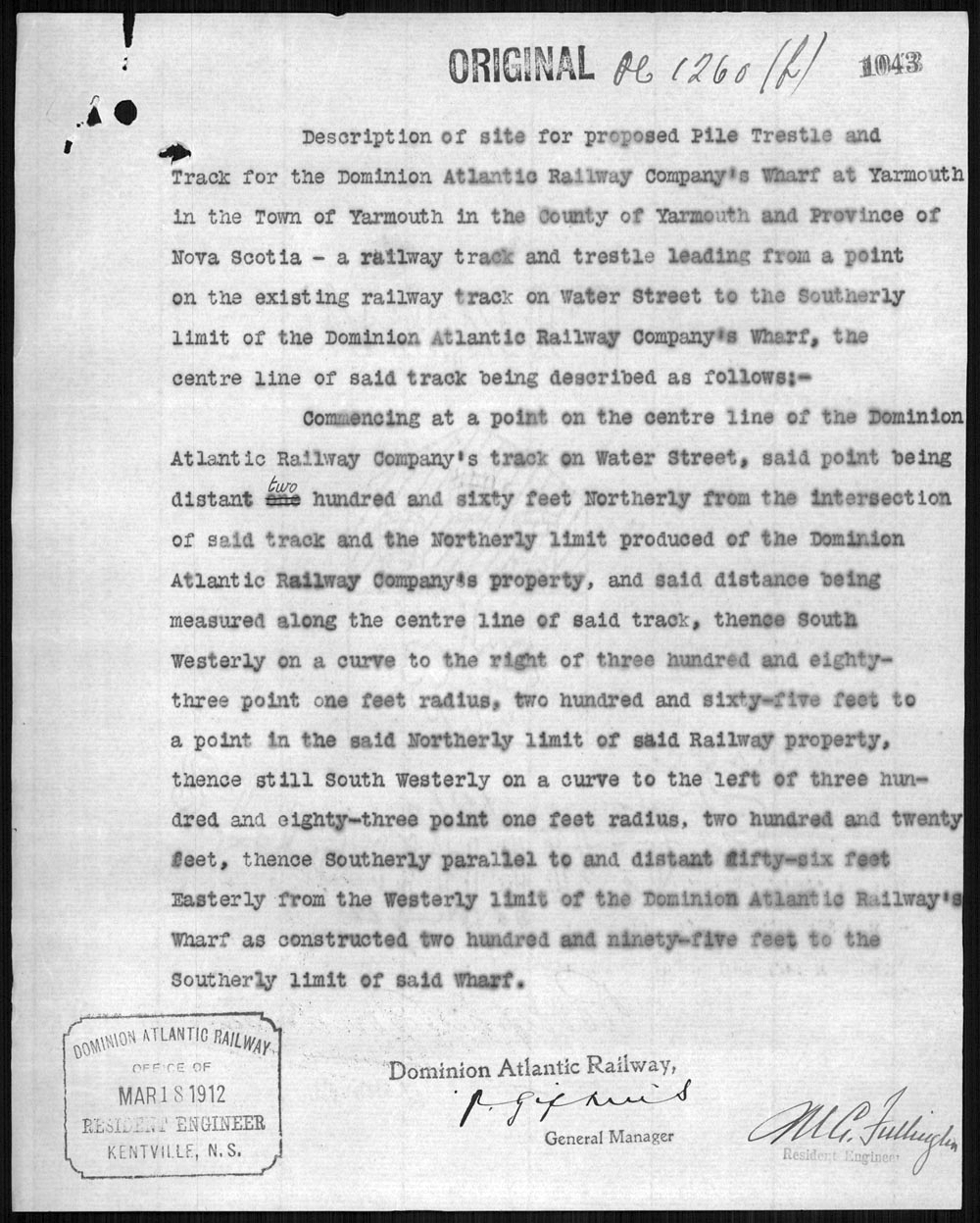 Supporting document for Order in Council approval 1260 of 1912, regarding expansion of the Evangeline Wharf (Yarmouth Wharf).