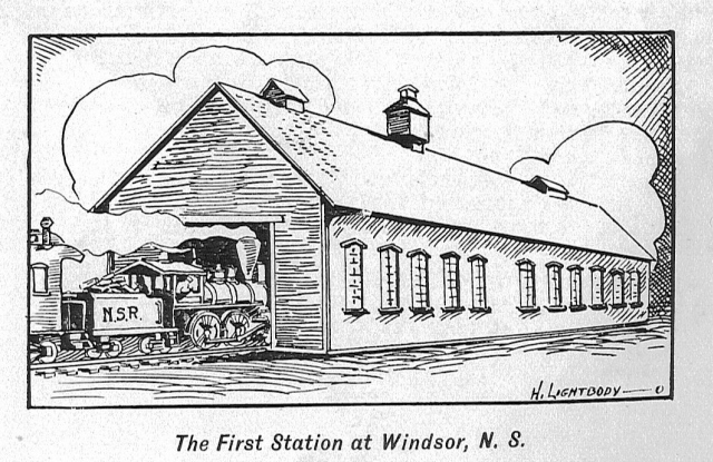 The first Windsor Station, built in 1858 by the Nova Scotia Railway. This drawing by H. Lightbody comes from Clarke's History of the Earliest Railways in Nova Scotia.