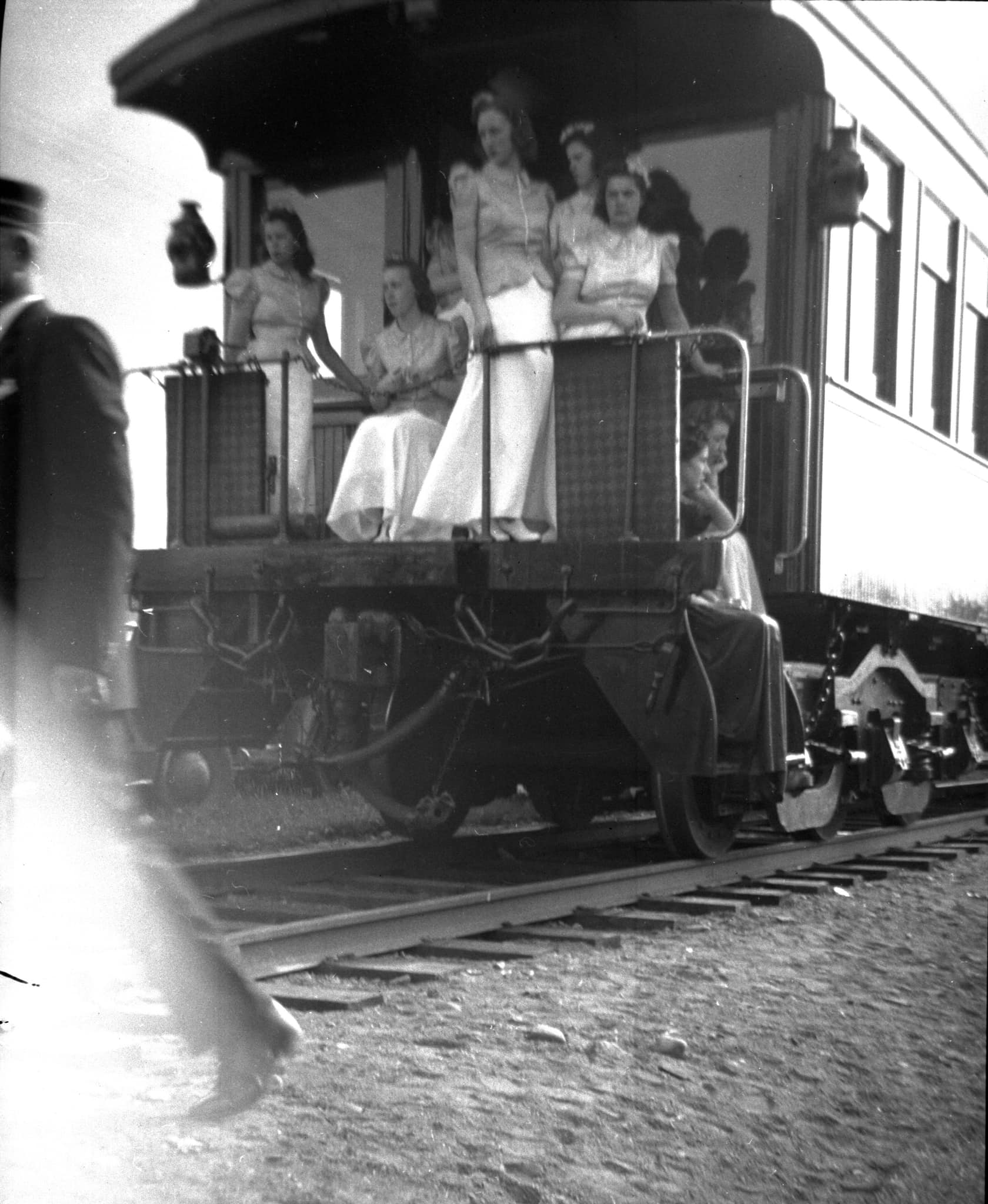 Photograph of a DAR passenger car from Chris Gertridge's Collection showing an Apple Blossom Special with several princesses and Queen Annapolisa, possibly Doris Parr who was Queen in 1948.