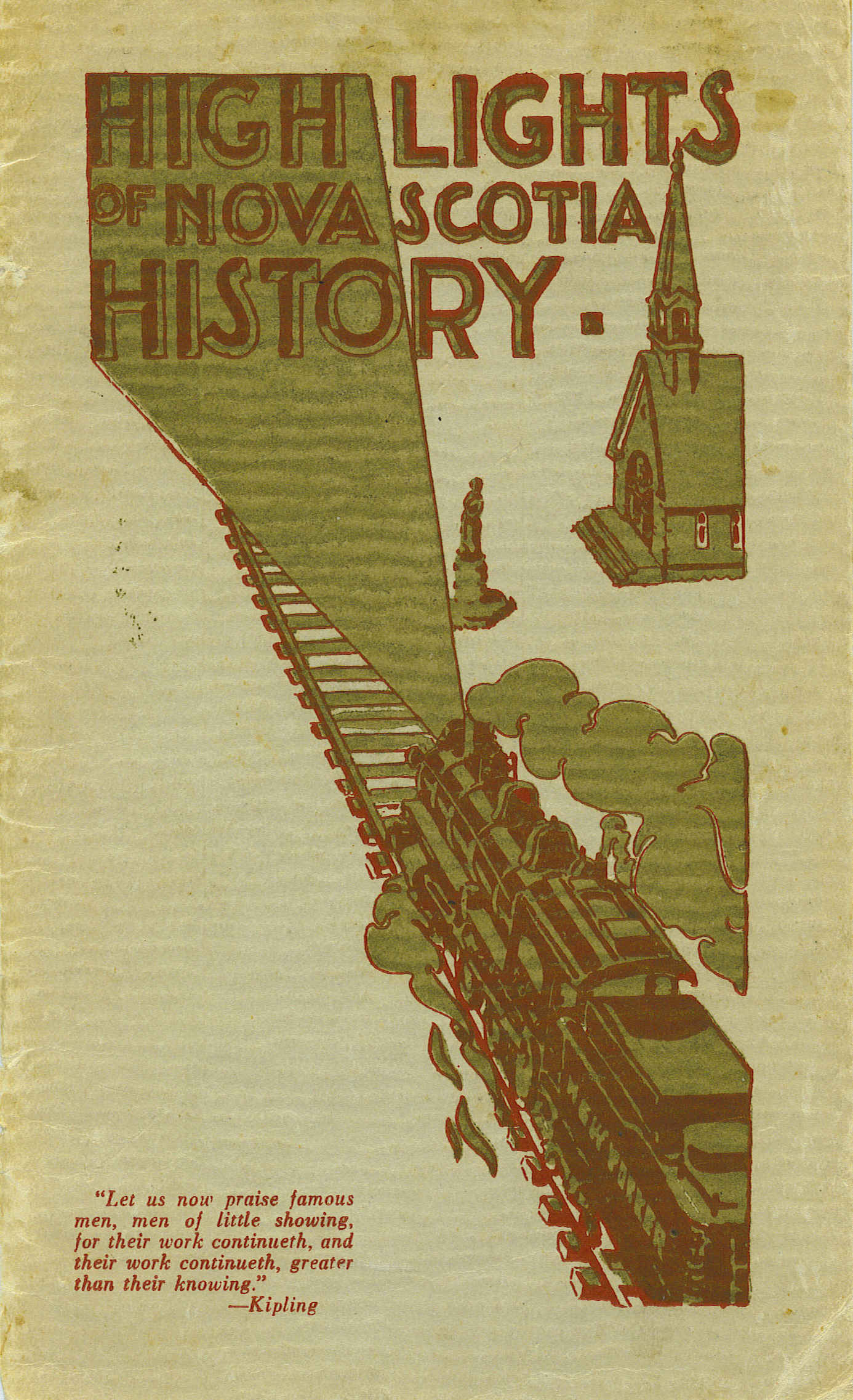 Cover of the 3rd Edition (1934) of Highlights of Nova Scotia History, a booklet on the history behind the names of DAR's locomotive fleet, showing the New Yorker train passing the Grand Pre park.