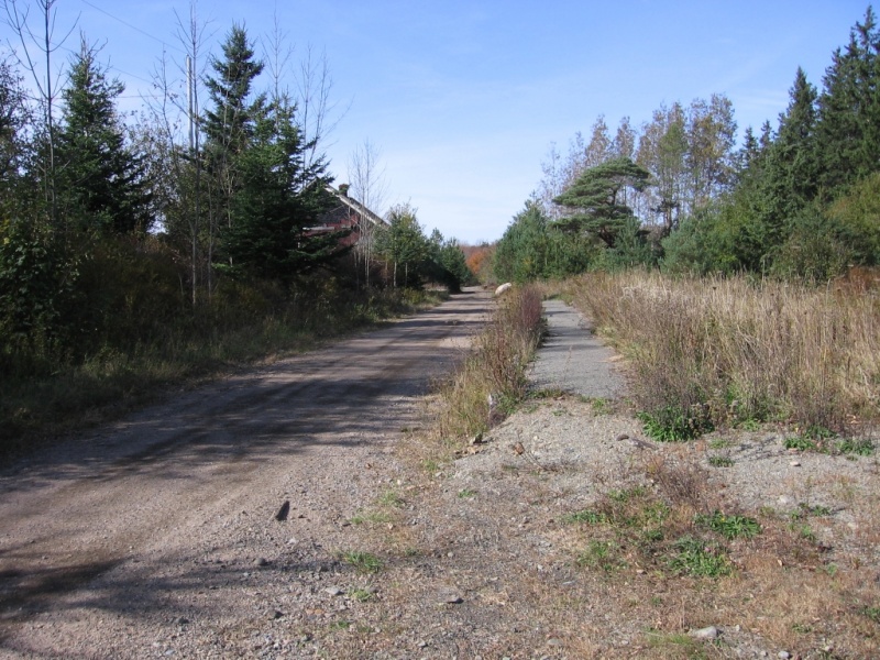 Looking railway east at Meteghan station. The paved platform remains from Via days. An old railway warehouse still stands.