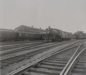 Locomotive No. 2627 with Train No. 95 westbound passenger train from Halifax switching out at the Kentville Railyard with the Kentville Repair Shop and Kentville Station, August 1955.