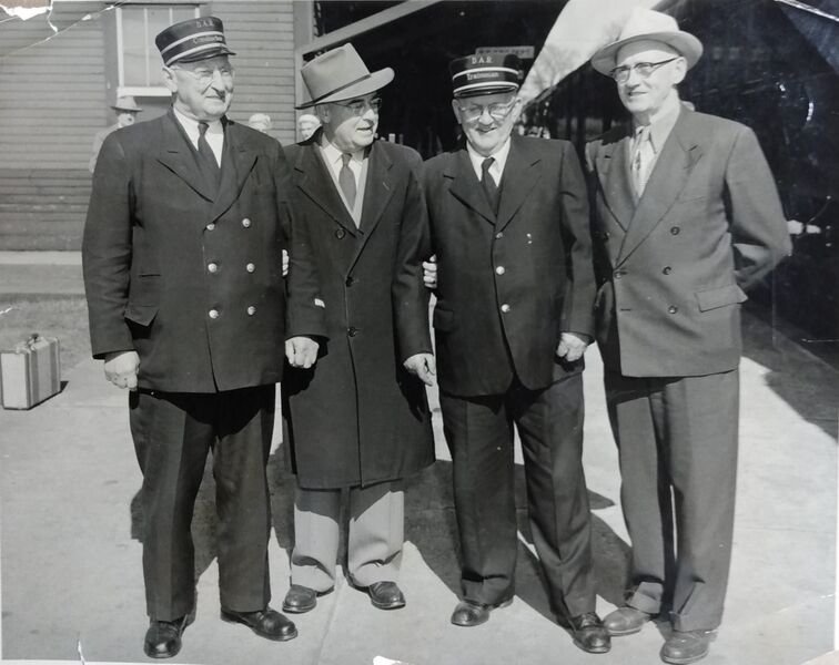| current | 15:28, 2 October 2023 | 1,972 × 1,565 (385 KB) | Dan Conlin (talk | contribs) | Retirement day for DAR employees at the Kentville Station showing left to right Harry William, conductor; Ray Christie, master mechanic; Cecil Guild, train man; William Cox, machinist, June 1 1956. Inscription on back of picture: "L to R June 1 1956 Retirement, Harry Williams conductor 40 years Ray Christie master mechanic, Cecil Guild train man 38 years , William Cox machinist 24 yrs" Photo courtesy Tony Kalkman shared in [https://www.facebook.com/groups/DARD... |