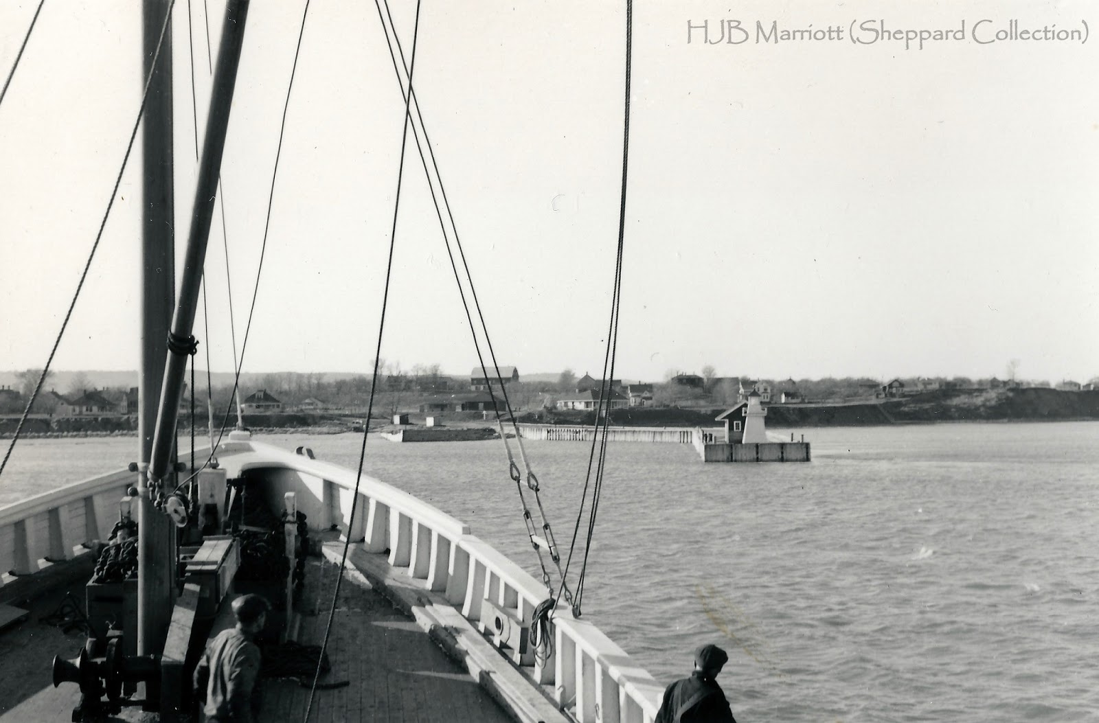 Photograph of the Kingsport Wharf at high tide showing the spur and wharf freight shed at high tide as the MV Student Prince II approaches to drop off a pilot, summer 1940. The photograph was taken by H. J. B. Marriott of Starr's Point, the customs collector at Port Williams.