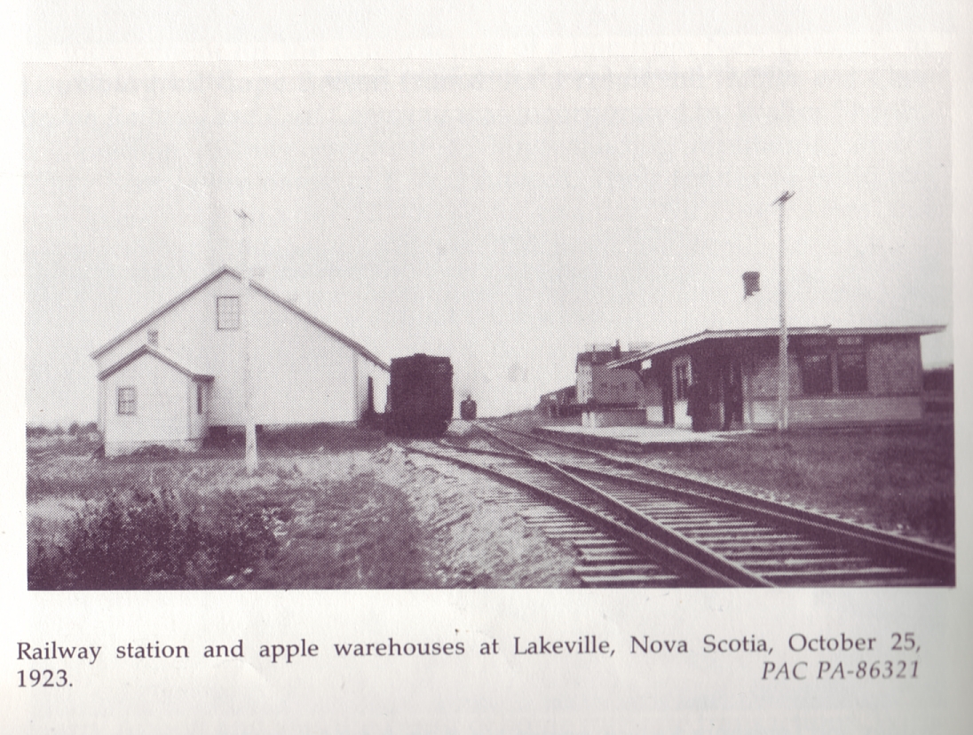 Lakeville station and apple warehouse with an eastbound train approaching, October 25, 1923.[1] The Lakeville apple evaporator can be seen in the background to the left of the station.