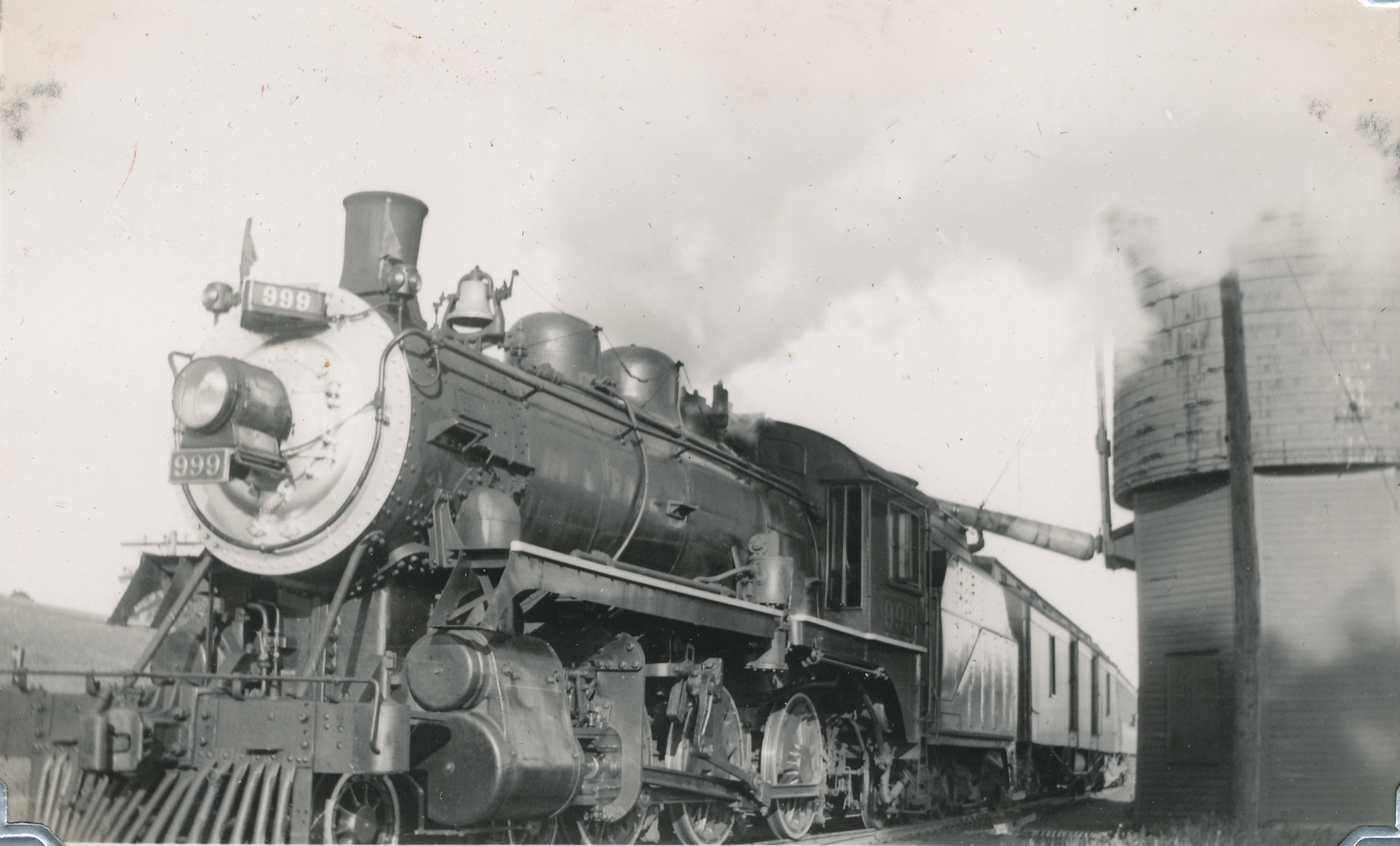 DAR Locomotive No. 999 takes water at the Windsor Water Tower with an eastbound passenger train, sporting its new custom DAR paint scheme with the silver smoke box front and maroon boiler and cab, photographed by Charles McBride. The photo is undated but the silver smoke box front indicate the photo was after this colour scheme was introduced in 1938[1] and before the wartime reversion to all-black in the early 1940s.