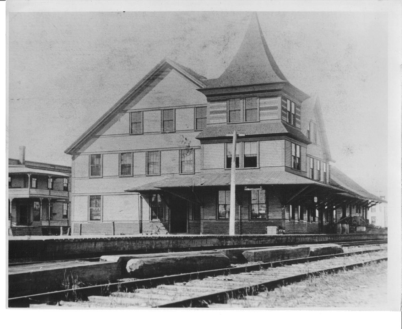 The second Middleton Station circa 1904. This was the large station built in 1890 as a union station to serve both the DAR and the Halifax & South Western Railway line which went south to Bridgewater and west to Port Wade. The station was destroyed by fire in 1916. The hotel in the background survived the big fire and remained until the 1950s. (The hotel can be seen still standing in this photo from 1956: Image:Middleton Railyard 1956.jpg. )