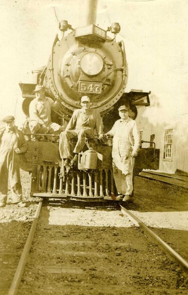 Locomotive No. 547 at Yarmouth, circa 1945. Man on right is engineer Harry Ward. Note windows of Yarmouth Enginehouse in background to right.