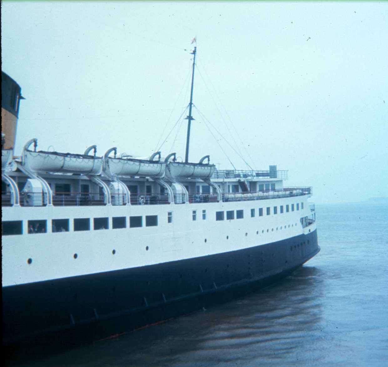From the summer of 1966, "POA Digby Wharf 1966" photos 1, 2, 3, 4, 5, 6 & 7 show how they got the Princess of Acadia into the government wharf. She would steam slowly in and a line would be thrown to the wharf, they would tie it up on the post (bollard) at the end (photo 2, but seen much better in this shot from J.A.M. and this shot from J.A.M. as well) and she would rotate into the docking area. If you look carefully at the water currents in shot numbers 3 & 4 (the bows on shot), you will notice that she had a bow thruster (the eddies on the bow) added when she was refitted for St. John -Digby Service. Her predecessor the Princess Helene once was caught by the wind after she backed away from the wharf and it took her close to hour to get her bows pointed toward the gut. My father, who was much more nautical than I, described her as being "In-Irons". Sailing ships in this condition would launch a boat and the crew would then row or kedge her so the wind would catch the sails. The bow thruster eliminated this condition and made her quite handy to dock on her own or to turn her around at St. John.
