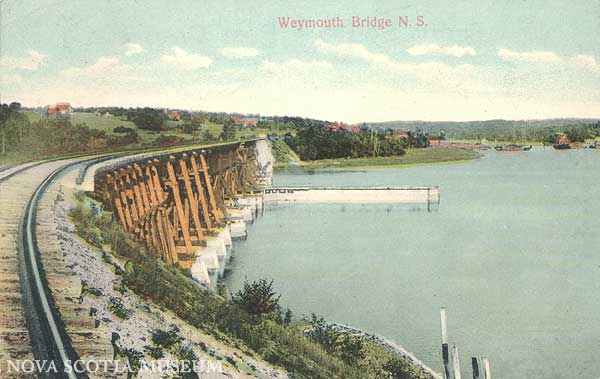 This colourized 1907 postcard is from the Nova Scotia Museum, History Collection. It shows the Sissiboo River Bridge, with Weymouth seen in the background.