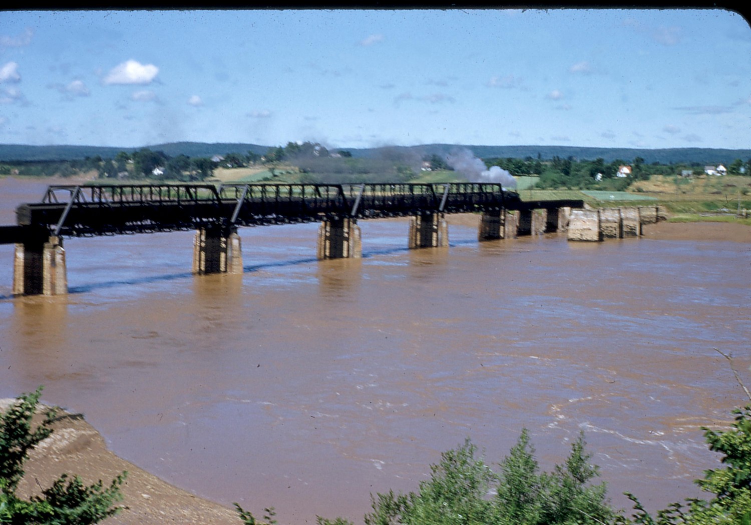 Original Kodachrome Slide, August 1951, Dominion Atlantic Train No. 98 crossing the Avon River Bridge near Windsor, NS.