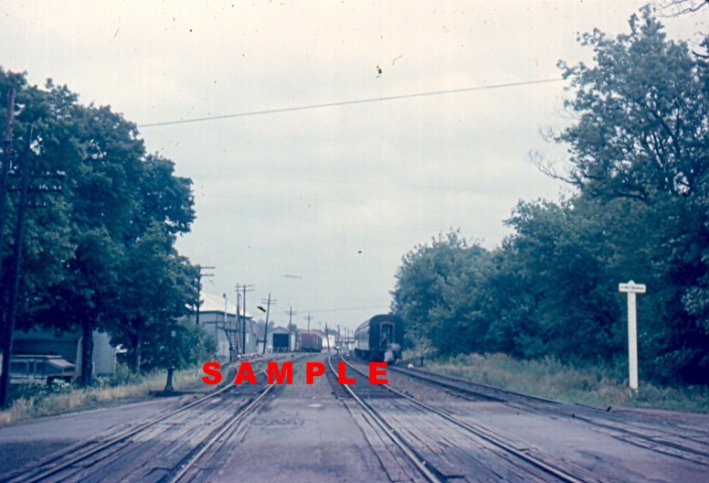 Original Gaf Slide, July 1975, Rear of Ocean Limited, arriving from Halifax, Dominion Atlantic interchange track on left, Truro, NS.