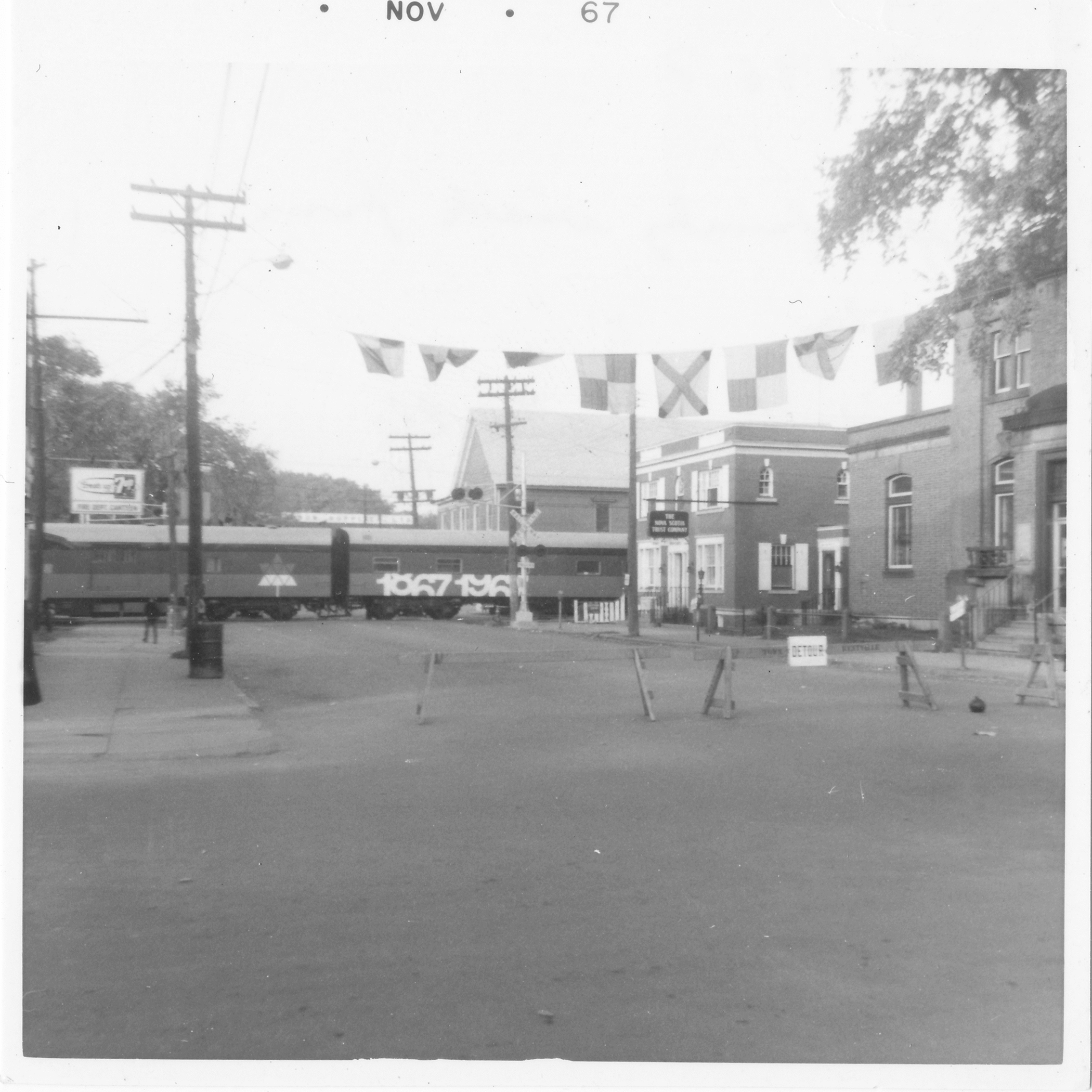 The Confederation Train at Kentville, looking north on Aberdeen Street at the level crossing by the Kentville Station, photographed by Tom Tupper, October 1967. Buildings are: left to right: the P. R. Ritcey Company, the Nova Scotia Trust Company and the Royal Bank of Canada.