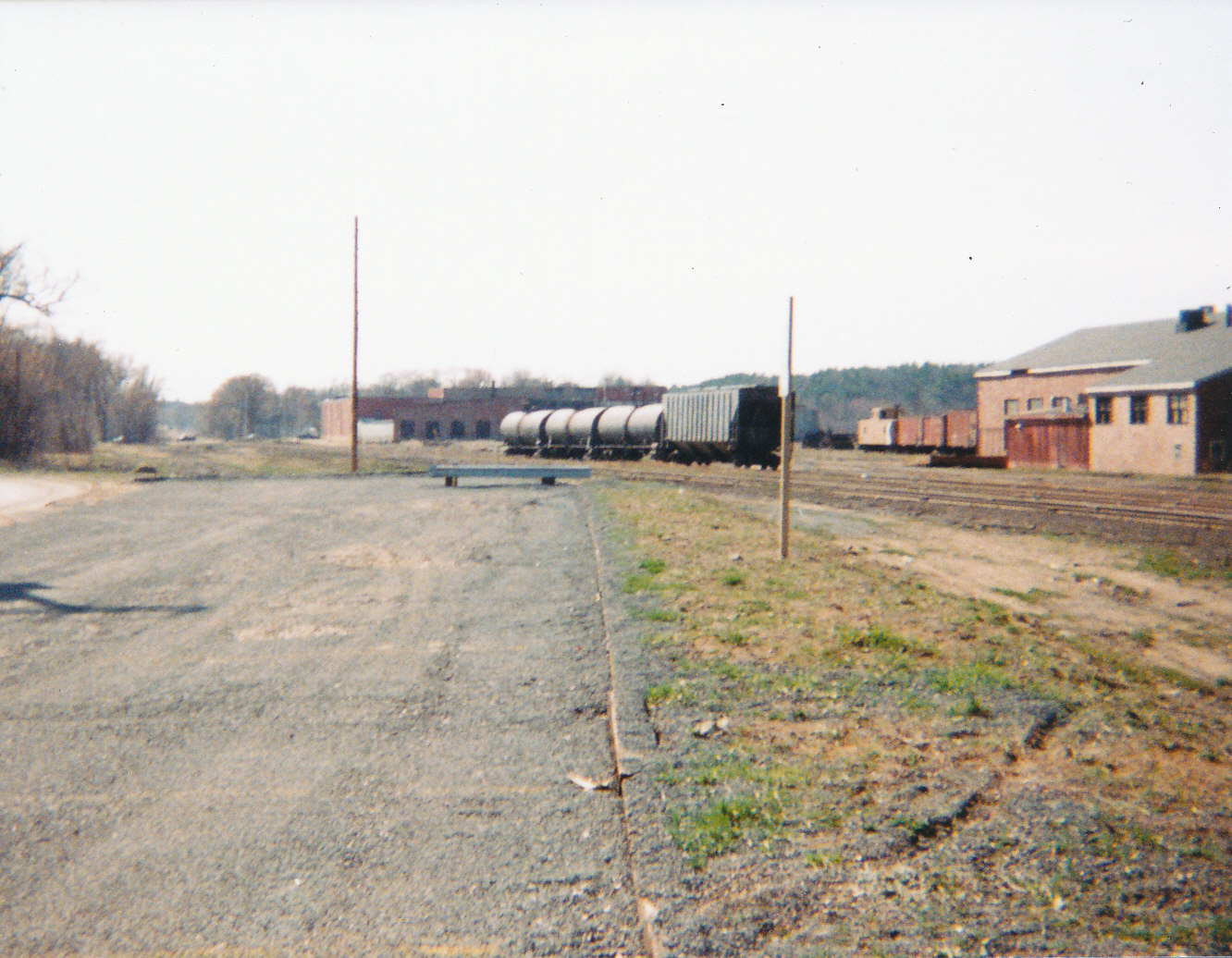The Kentville Railyard looking west in its final years of operation with a sample of the last of its valley customers, fuel cars for CFB Greenwood and a covered hopper for Steam Mill Village with a few MOW cars parked at the car shop to the right and the roundhouse serving as a juice warehouse in the background, photographed by Tom Tupper, 1990.