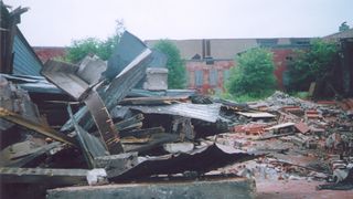 Demolition of the Kentville Roundhouse, ruins of stall 1 to 5, with the Canada Foods Plant in the background, photographed by Tom Tupper, July 9, 2007.
