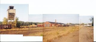 Composite panoramic photograph of the Kentville Railyard showing left to right, the Kentville Coaling Tower, Kentville Car Shop and the Kentville Repair Shop, photographed by Tom Tupper, October 1990. Note that the four south yard tracks had recently been removed but the north yard tracks were still in use.
