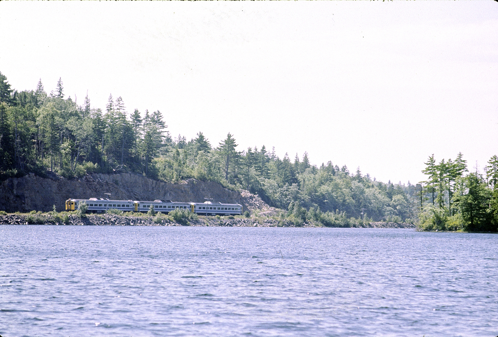 RDCs in the westbound Dayliner at Mount Uniacke, photographed by David Othen across Lake Martha from the Uniacke House Museum, September 1983.