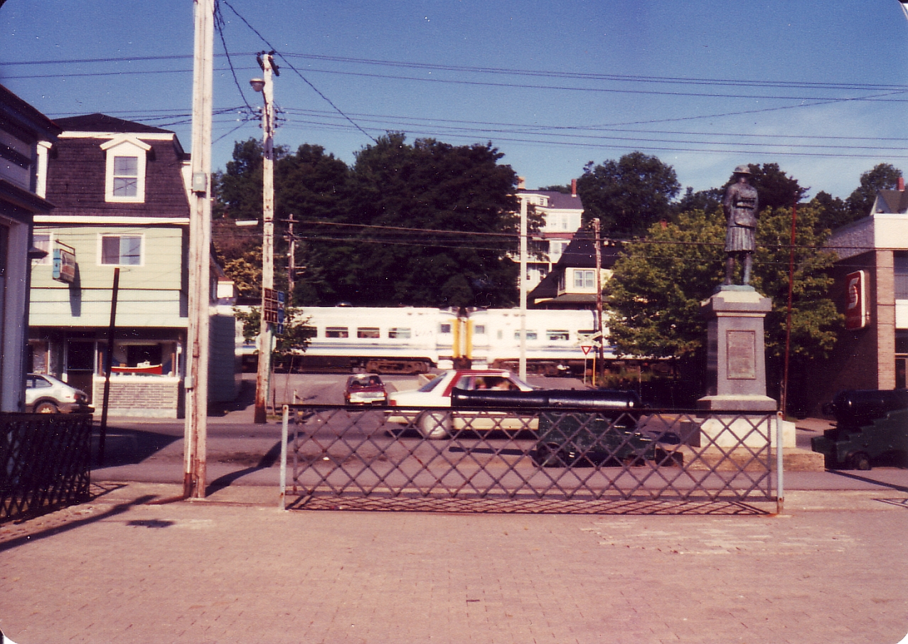 VIA RDC's pass by the cenotaph in Digby. Undated.