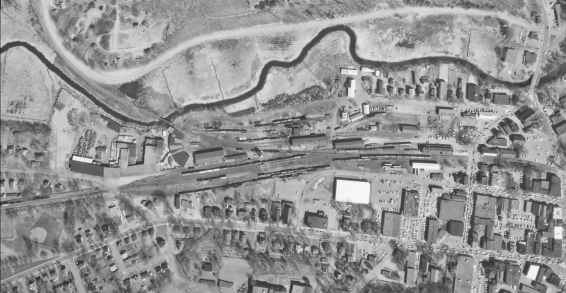 Canada Foods Plant and tracks of the Kentville Railyard, circa 1948.